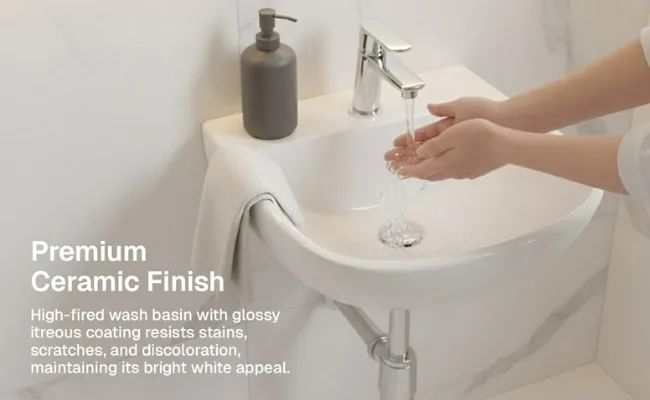 - Premium Ceramic Finish: High-fired wash basin with glossy vitreous coating resists stains, scratches, and discoloration, maintaining its bright white appeal.