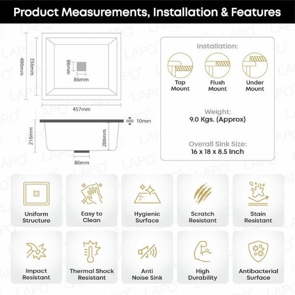 - Easy to Install & Low Maintenance: Simple installation design fits most standard kitchen counters and the non-porous quartz surface resists stains, odors, and bacteria buildup.