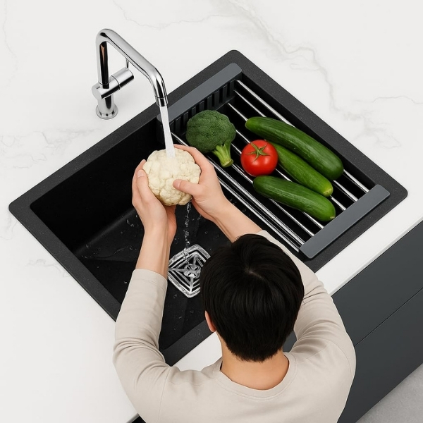 - Functional and Modern Design: Equipped with an integrated sink drainer for efficient water flow and drying, plus a deep basin that reduces splashing during heavy washing