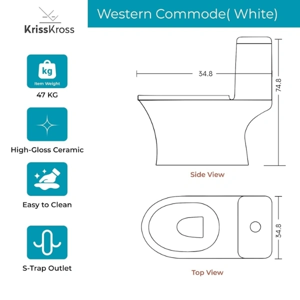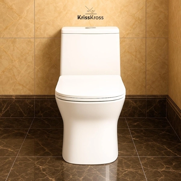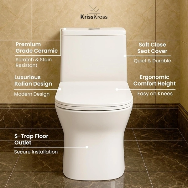 Upgrade daily comfort with a KrissKross one‑piece Western commode designed for Indian bathrooms, combining a seamless ceramic body with siphonic‑flush efficiency to save water without sacrificing rinse performance. The floor‑mounted S‑trap outlet aligns with common 9–12 inch rough‑ins, making replacements simple during renovations, while the soft‑close, quick‑release seat adds quiet convenience and lifts off for deep cleaning. Finished in high‑gloss vitreous ceramic, the smooth glaze resists stains and wipes clean in seconds, and the included hardware supports fast professional installation for optimal sealing and alignment. Choose KrissKross for dependable quality and cohesive styling across square, elongated, and rimless variants in the brand’s one‑piece range.