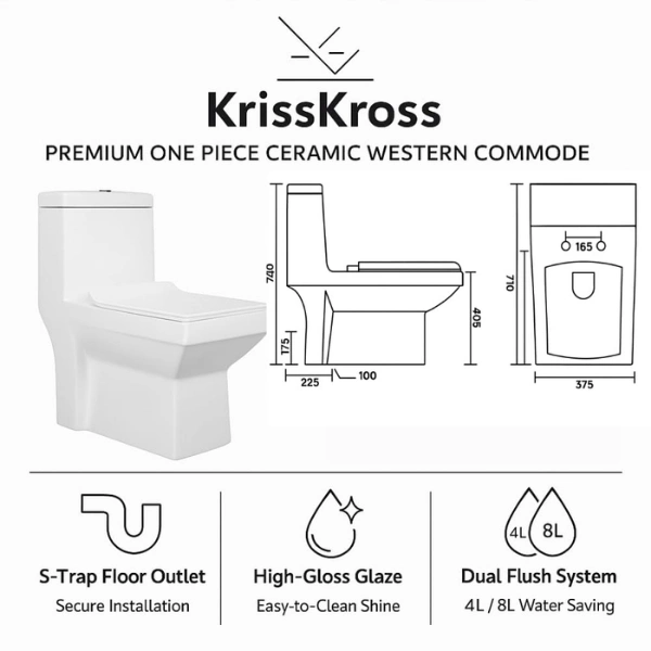 - 𝗖𝗼𝗺𝗽𝗼𝗻𝗲𝗻𝘁𝘀: Complete with a one-piece design, soft-close toilet seat, and inlet & outlet rubber gaskets, the KrissKross commode ensures convenience and ease of cleaning with its fully glazed ceramic surface.